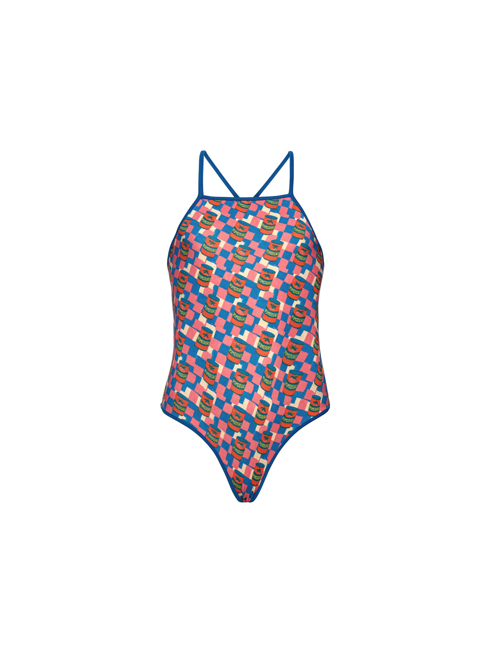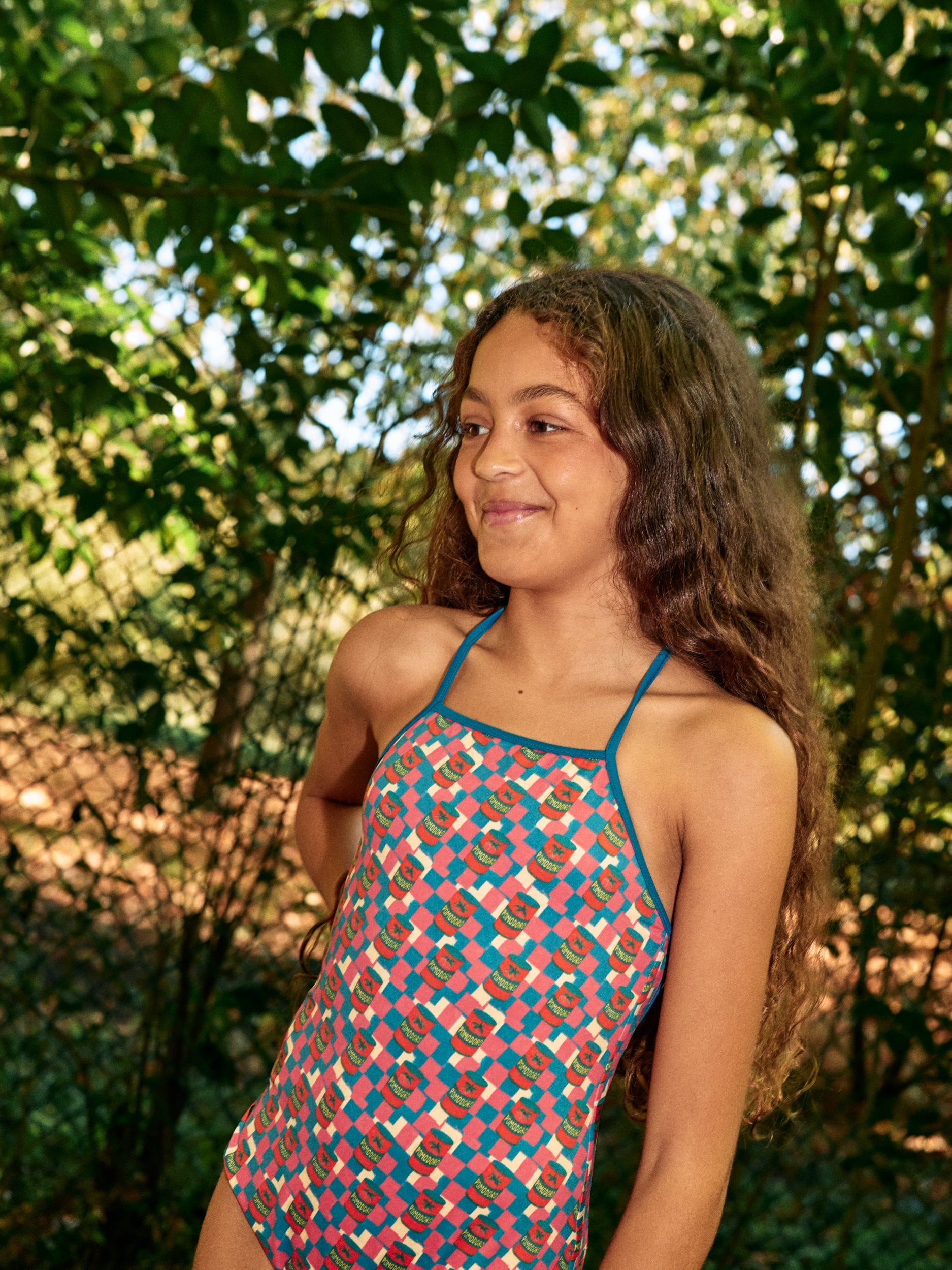 Children's swimsuit with a straight neckline and crisscrossing straps at the back.