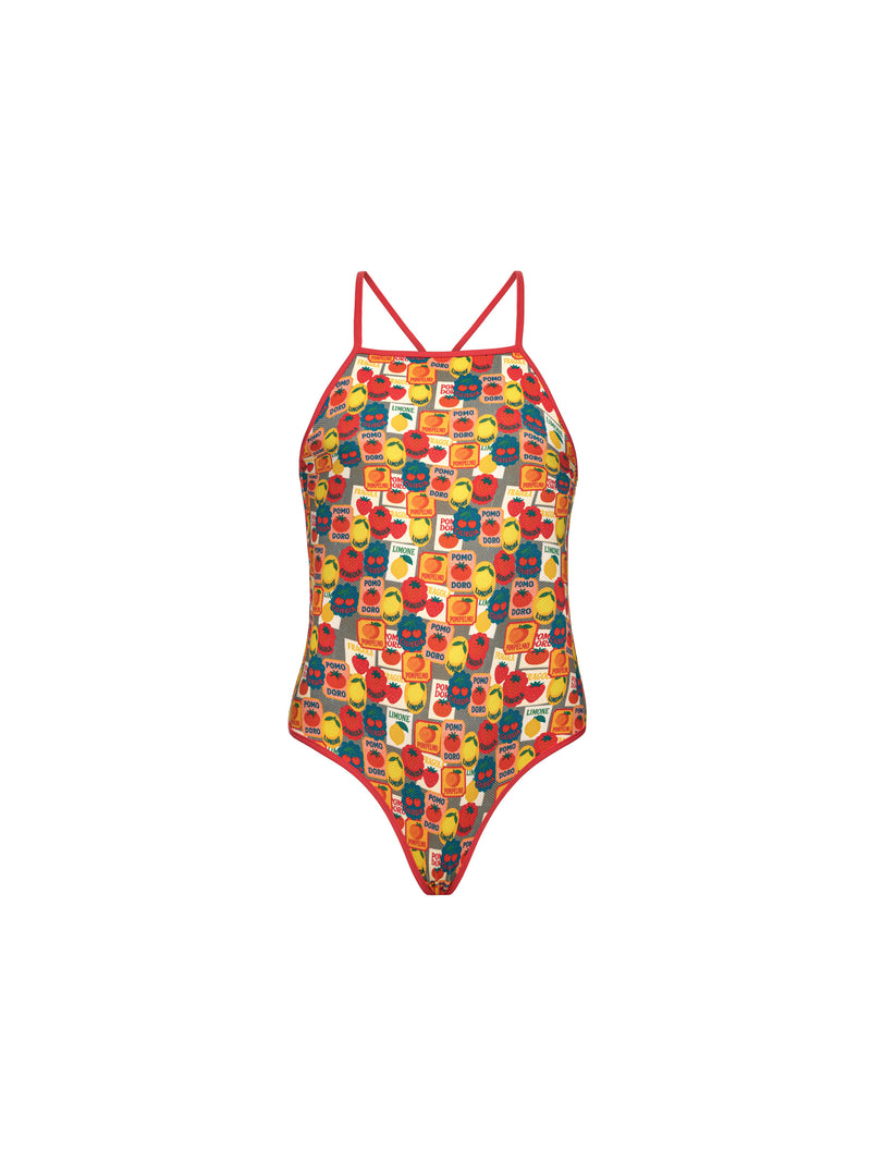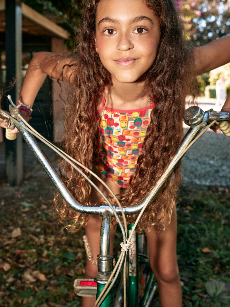 Children's swimsuit with a straight neckline and crisscrossing straps at the back.