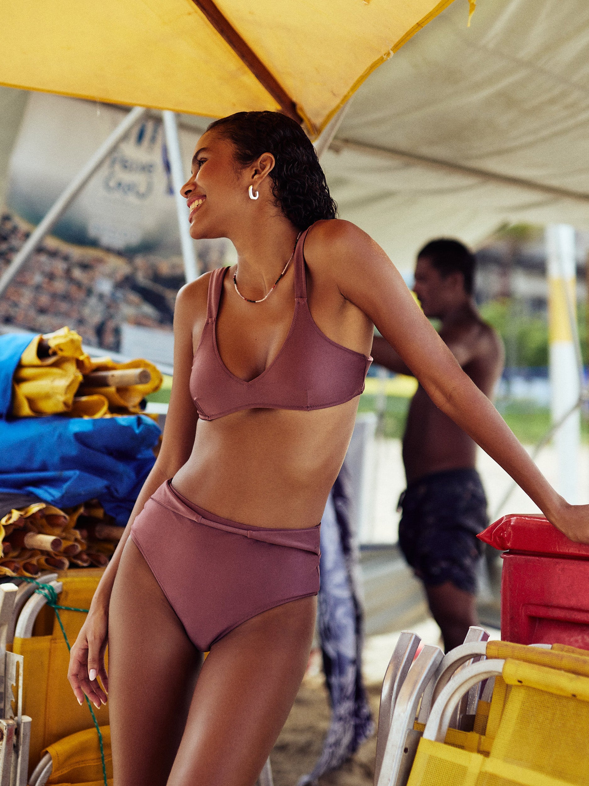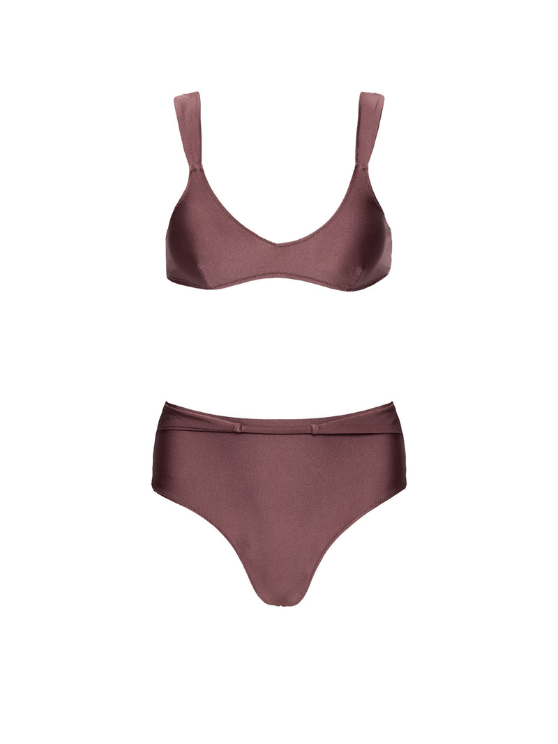 Biquíni com alças ajustáveis nas costas com copas amovíveis. Parte de baixo de cinta subida com pormenor de cinto na frente