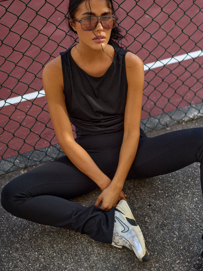 Top manga cava, com abertura na lateral. Franzido na frente e nas costas. Detalhes pensados para destacar cada movimento, com design que mistura conforto e presença.