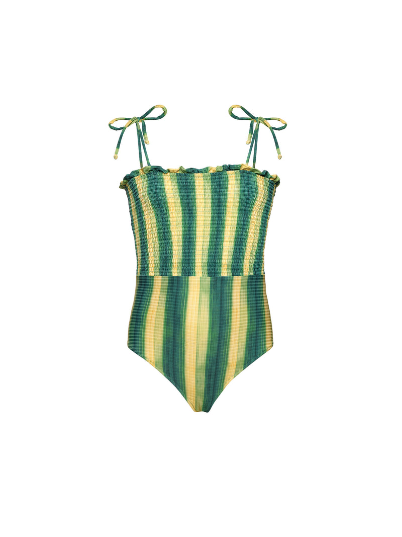 Bañador infantil con detalle fruncido en la parte superior. Tirantes ajustables con cierre de nudo.