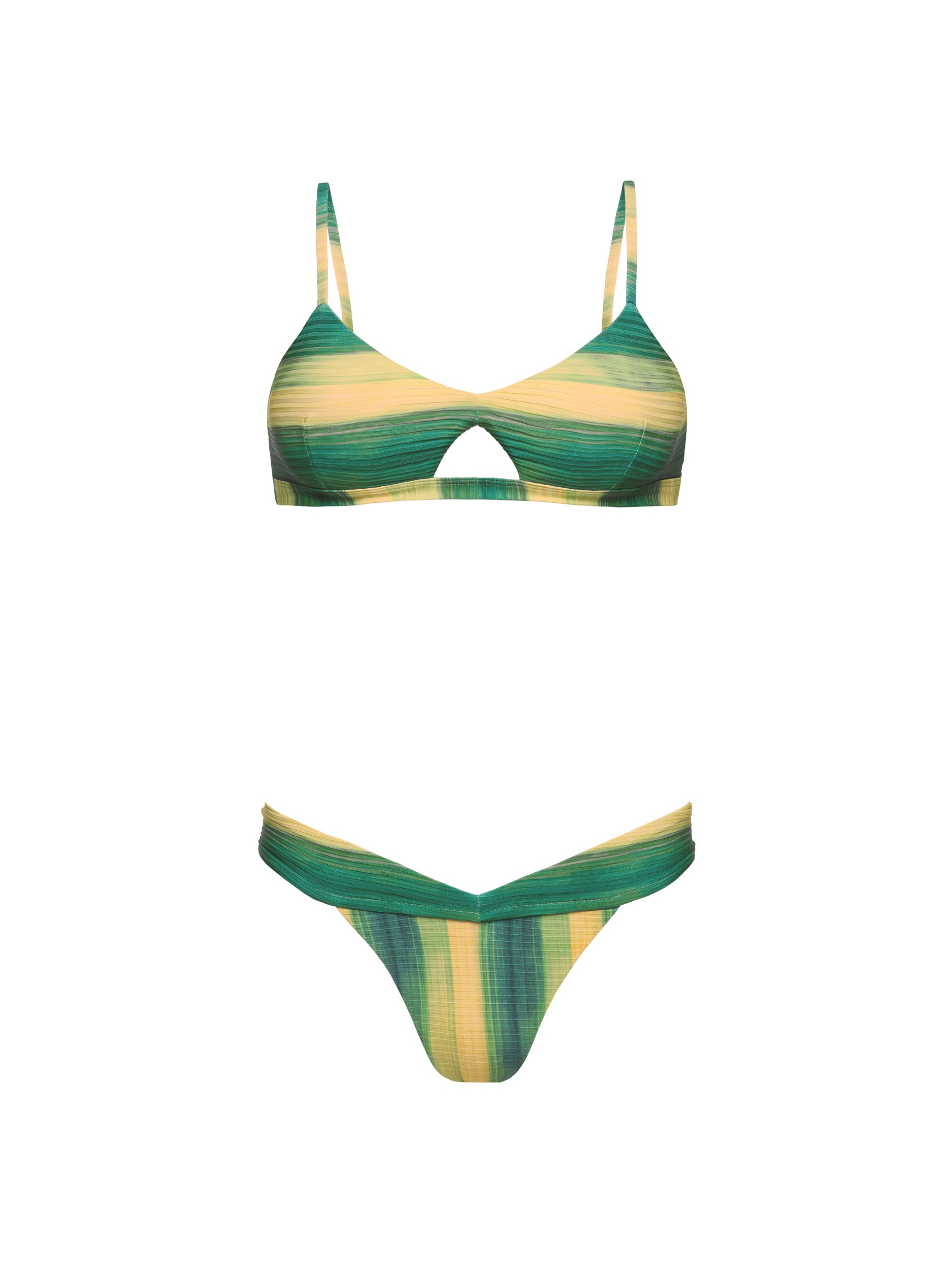 Bikini con escote en V y abertura delantera que realza el escote. Tirantes ajustables para un ajuste perfecto y copas extraíbles para mayor comodidad. Braguita con cintura en V.