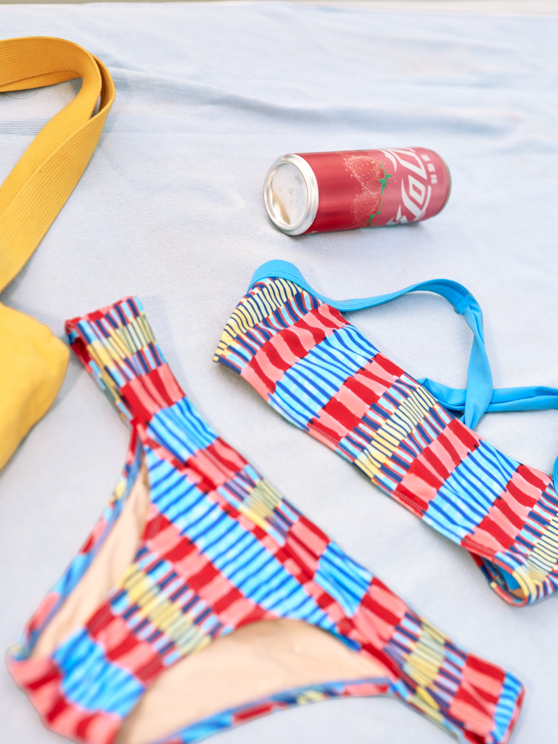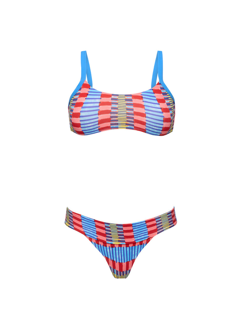 Bikini con tirantes anchos cruzados y ajustables en la espalda. Parte de abajo con detalle de banda en la cintura.
