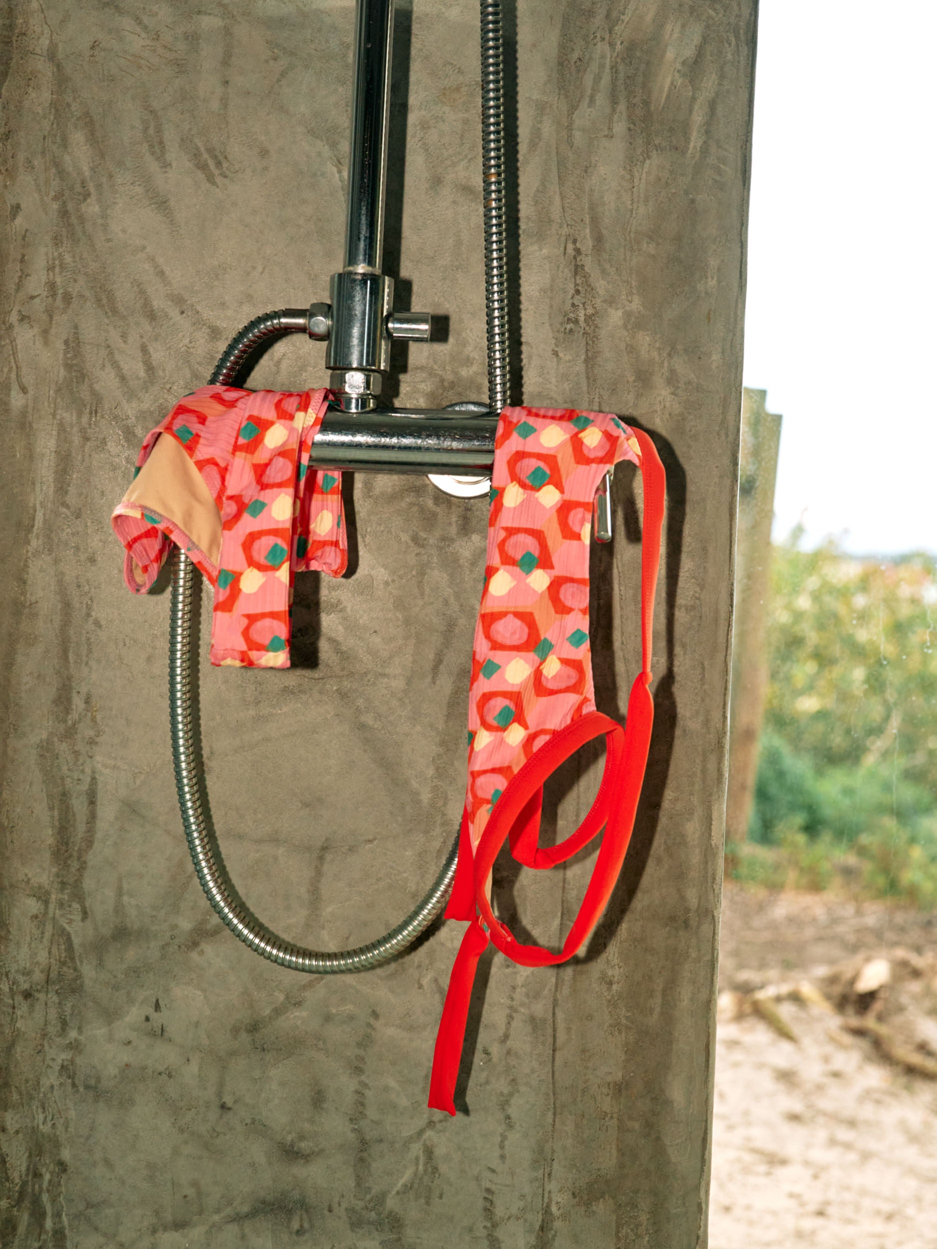 Bikini con tirantes anchos cruzados y ajustables en la espalda. Parte de abajo con detalle de banda en la cintura.