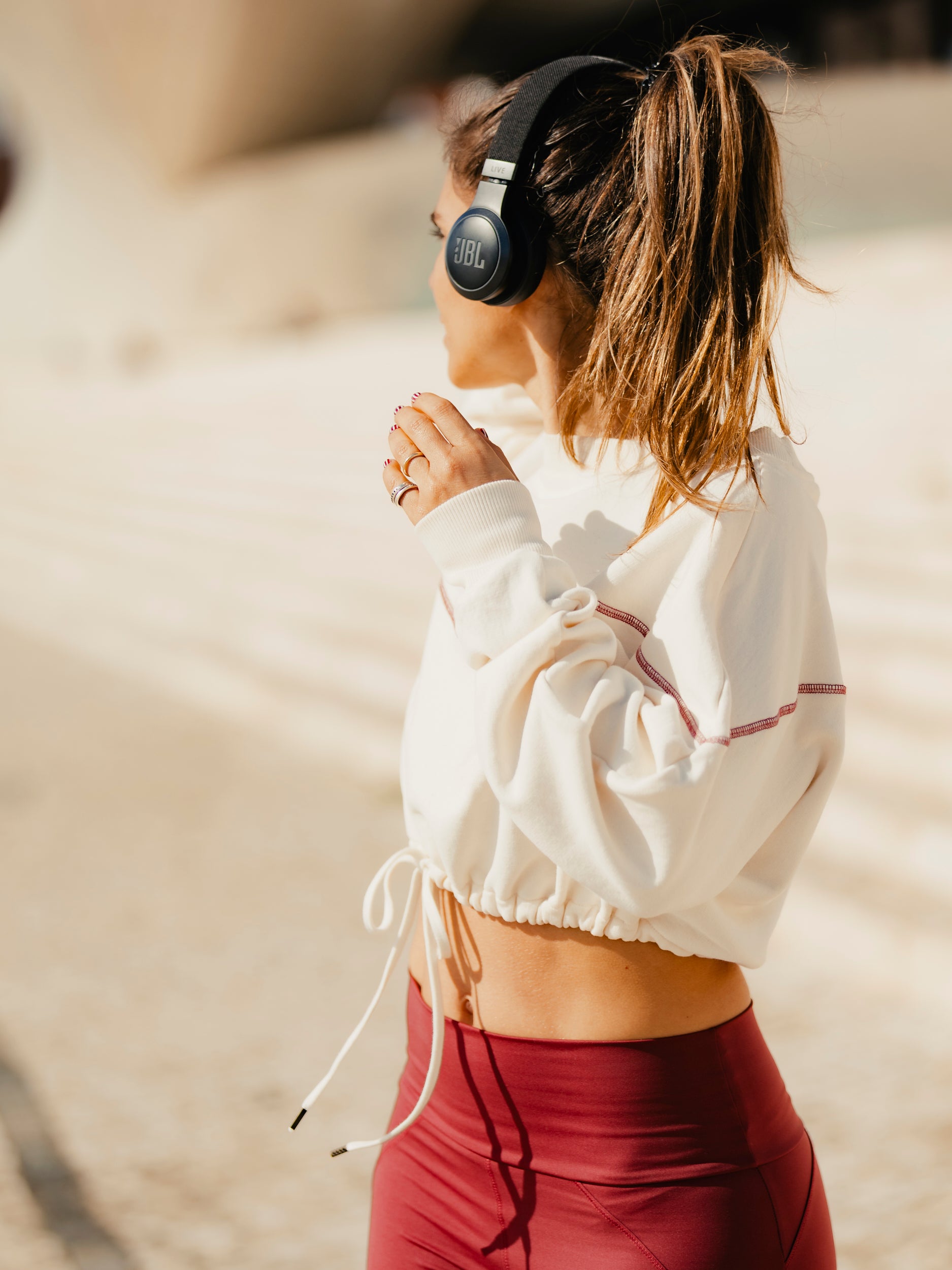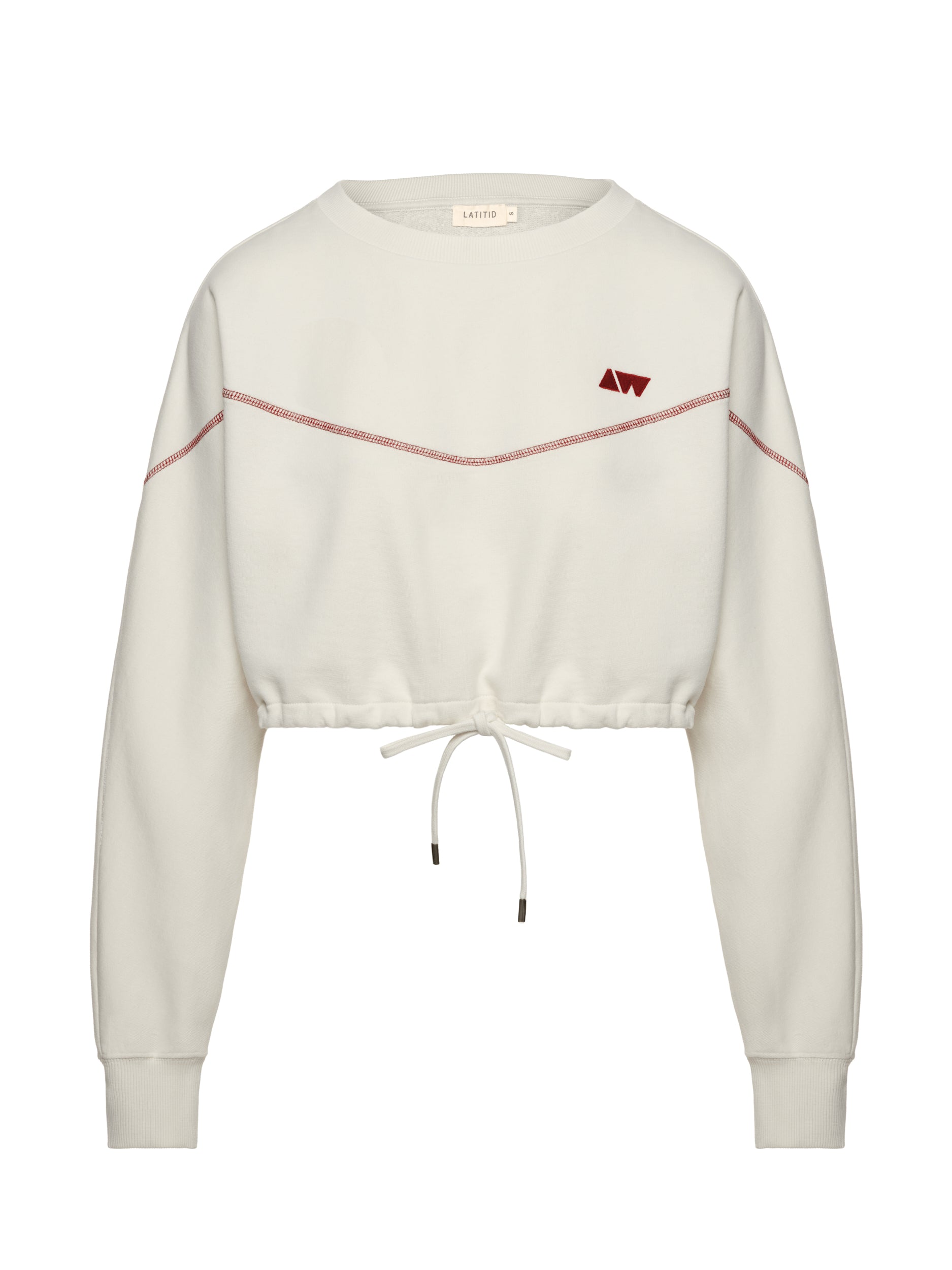 Sudadera corta en blanco escarchado con detalle de costuras burdeos, ajustable en la parte inferior. Un corte que combina libertad y presencia, ideal para marcar estilo con naturalidad.