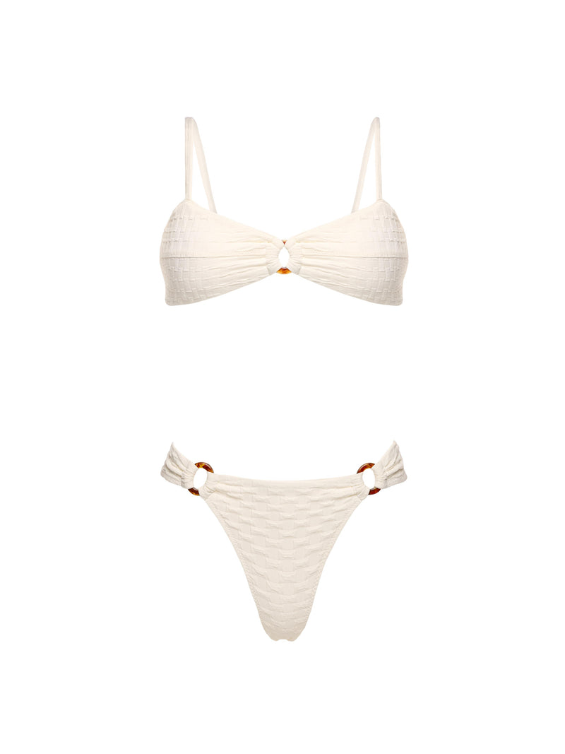 Biquíni com top de alças ajustáveis e detalhe de argola à frente, amarra nas costas. Copas amovíveis para maior conforto. Parte de baixo de cintura baixa, com duas argolas laterais. Lycra com textura