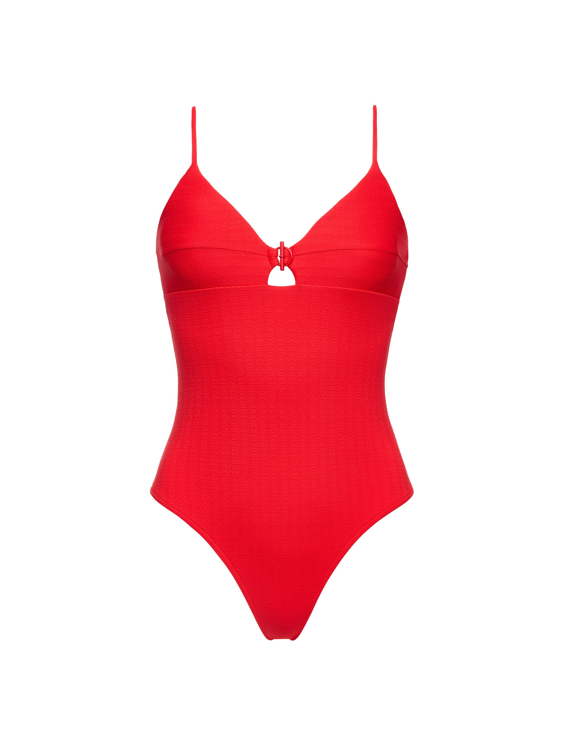 Fato de banho com decote em V e pormenor de acessório na frente com copas amovíveis e alças ajustáveis.