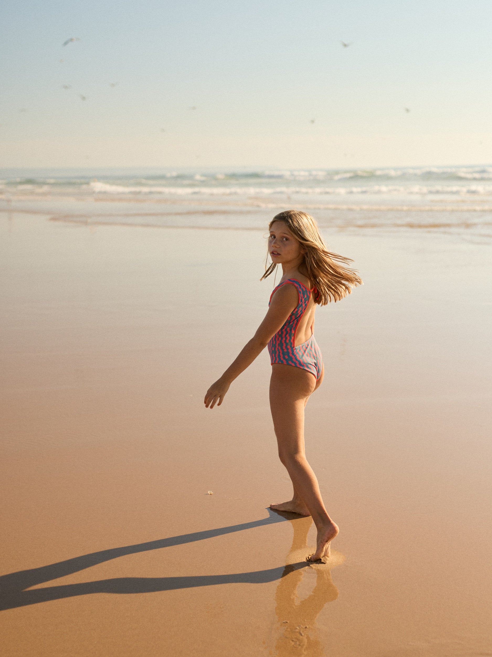 Fato de banho infantil com decote redondo, alças largas e costas abertas, com laço ajustável e detalhe de clorete em contraste.